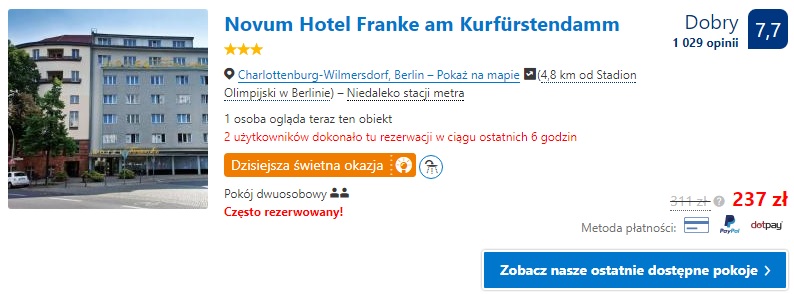 Proponujemy nocleg w Novum Hotel Franke am Kurfürstendamm położonym niedaleko stadionu gdzie za dwie noce w pokoju dwuosobowym zapłacimy 445 zł (ok. 112 zł/os./noc). W przypadku jednego noclegu w tym samym hotel, za dwuosobowy pokój zapłacimy 237 zł ( ok. 119 zł/os./noc).