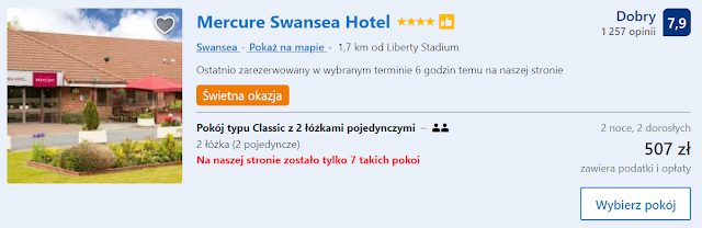 Proponujemy dwudniowy pobyt w Mercure Swansea Hotel. Za nocleg w tym obiekcie zapłacimy 595 zł za jedną oraz 507 zł za dwie osoby (ok. 127 zł os./noc).