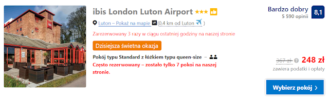 Dla kibiców, którzy będą opuszczać Wielką Brytanię z Luton, polecamy ibis London Luton Airport. Tutaj za jednodniowy nocleg w pokoju jednoosobowym zapłacimy 288 zł i 248 zł za pokój dwuosobowy (124 zł os./noc).
