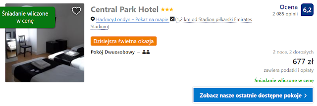Dla kibiców Arsenalu polecamy Central Park Hotel, który oferuje dwudniowy pobyt w pokoju dwuosobowym ze śniadaniem za 677 zł (ok. 169,25 zł os./noc).