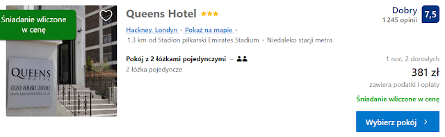 Fanom drużyny The Gunners będzie odpowiadał oddalony niecałe 1,5 km od Emirates Stadium Queens Hotel. Za pobyt w pokoju jedno i dwuosobowym zapłacimy kolejno 246 zł oraz 381 zł (190,5 zł os./noc).