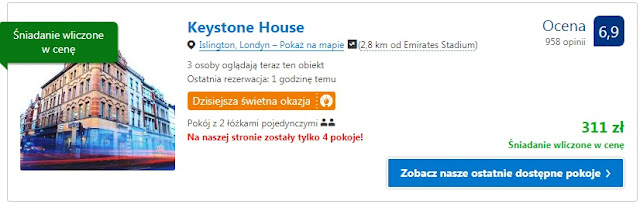 Proponujemy pobyt na jedną noc w dwóch miejscach położonych niedaleko Emirates Stadium. Za pobyt dla dwóch osób w Beaconsfield Hotel zapłacimy 307 zł (154 zł/os/noc). Inna opcja to Keystone House, gdzie cena za jedną noc dla dwóch osób to 311 zł (156 zł/os/noc).