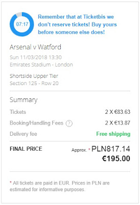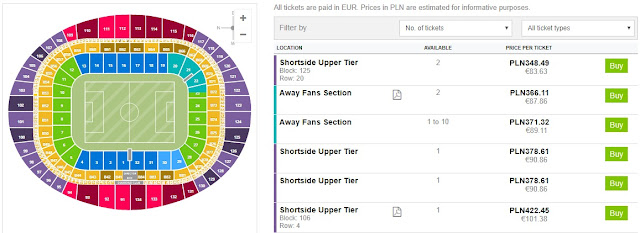 Wejściówki na spotkanie znajdziemy na rynku wtórnym. Dwa bilety na mecz można nabyć za 818 zł (409 zł za jeden bilet). Istnieje także możliwość kupna pojedynczych wejściówek. Należy pamiętać, że część z ofert dotyczy dostawy biletów tylko na terenie Anglii, więc warto uprzedzić znajomych lub hotel o nadejściu przesyłki. Uwaga! Nie przechodzimy na polską wersję (Stubhub) a pozostajemy w angielskiej wersji strony (ticketbis.net) – znajdziemy tam zdecydowanie tańsze bilety! REZERWUJ====>
