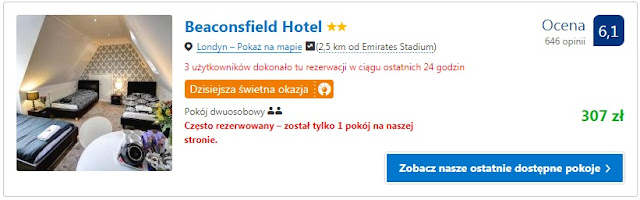 Proponujemy pobyt na jedną noc w dwóch miejscach położonych niedaleko Emirates Stadium. Za pobyt dla dwóch osób w Beaconsfield Hotel zapłacimy 307 zł (154 zł/os/noc). Inna opcja to Keystone House, gdzie cena za jedną noc dla dwóch osób to 311 zł (156 zł/os/noc).