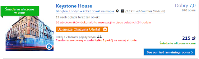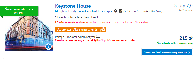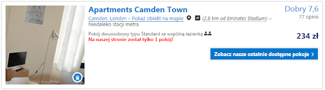 W Londynie w zależności od wybranej opcji będziemy nocować jedną lub dwie noce. Proponujemy nocleg w Keystone House gdzie za pokój z dwoma pojedynczymi łózkami zapłacimy 215 zł (ok. 108 zł za osobę za noc). Obiekt wysokooceniany przez użytkowników portalu Booking.com oraz położony w pobliżu Emirates Stadium (ok. 2,8 km) a dodatkowo śniadanie wliczone jest w cenę wynajmu. Druga propozycja to Apartments Camden Town, za który zapłacimy 234 zł za noc (ok. 117 zł za noc). Obiekt również wysokooceniany przez użytkowników portalu Booking.com, położony w pobliżu Emirates Stadium (ok. 2,8 km) a także w pobliżu metra.