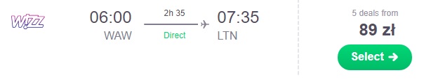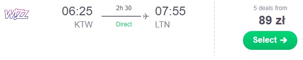 Proponujemy poranne wyloty w dniu meczu 1.04 z Poznania do Luton za 39 zł* (cena regularna 59 zł) REZERWUJ ==== >, z Gdańska do Luton za 39 zł* (cena regularna 59 zł) REZERWUJ ==== >, z Katowic do Luton za 44 zł* (cena regularna 89 zł) REZERWUJ ==== >, lub z Wraszawy do Luton za 44 zł* (cena regularna 89 zł) REZERWUJ ==== >
