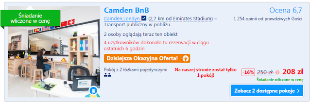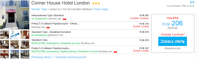 Corner House Hotel London pokój dwuosobowy w hotelu oddalonego ok 2km od Emirates Stadium to koszt 206 zł (ok 103 zł za osobę za noc)