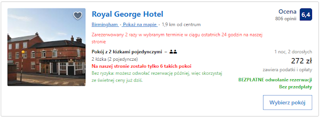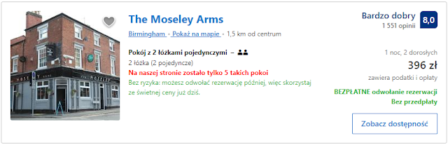 Standardowo dwie propozycje noclegu w Birmingham. Tańsza opcja to Royal George Hotel, w którym za pobyt dla jednej-dwóch osób w terminie 14-15 marca zapłacimy 272 zł. Trochę droższy będzie hotel The Moseley Arms, w którym cena za tą samą usługę wyniesie 396 zł. Oba obiekty znajdują się w dobrej lokalizacji, niedaleko centrum miasta.