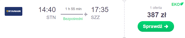 Z Londyn Stansted do Bydgoszczy powrócimy za 262 zł REZERWUJ====>, natomiast do Szczecina za 387 zł REZERWUJ====>.