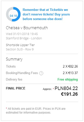Tanie wejściówki można znaleźć na rynku wtórnym. Przy kupnie dwóch biletów, jeden możemy dostać już za ok. 403 zł. Kupno pojedynczej wejściówki wiąże się z kosztem ok. 416 zł. Warto pamiętać, że bilet może być dostarczony tylko na terenie UK, w związku z czym należy uprzedzić hotel o nadejściu przesyłki, bądź znajomego u którego będziemy nocować podczas pobytu w Anglii. Uwaga! Nie przechodzimy na polską wersję (Stubhub) a pozostajemy w angielskiej wersji strony (ticketbis.net) – znajdziemy tam zdecydowanie tańsze bilety! – REZERWUJ====>