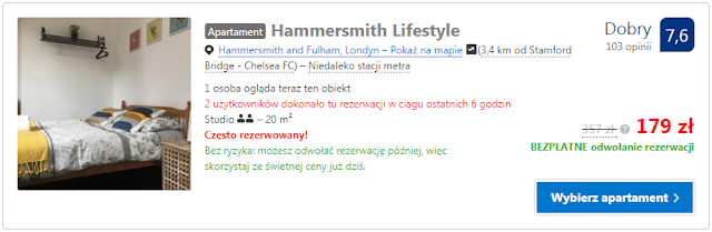 Nocleg proponujemy w położonych niedaleko Stamford Bridge w Hammersmith Lifestyle gdzie za noc dla dwóch osób zapłacimy 179 zł (89,5zł/os/noc). Inną, nieco droższą opcją jest Caring Hotel, tam jedna noc dla dwóch osób to koszt 182 zł (91 zł/os/noc).