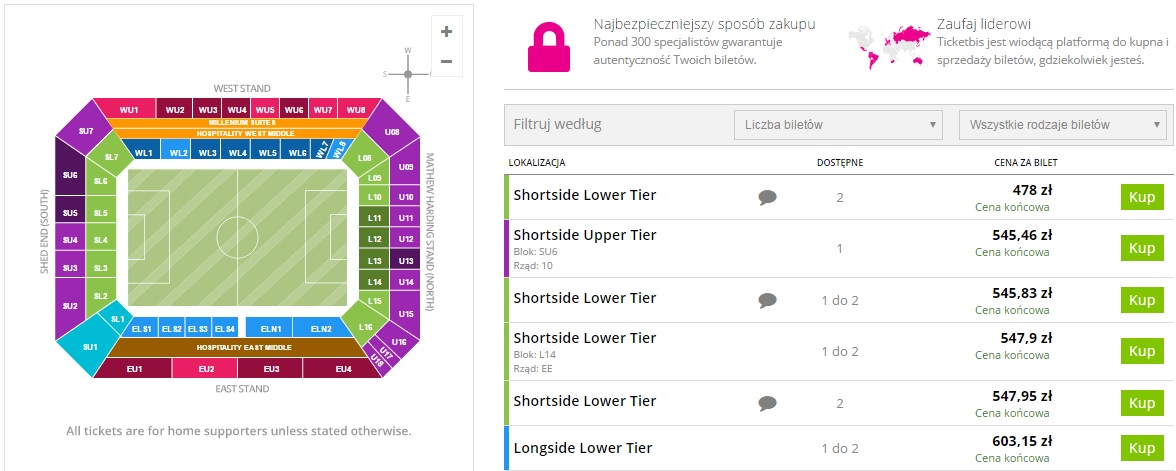 Bilet na mecz do kupienia na stronie ticketbis zarezerwuj TUTAJ=====> a najtańsze do kupienia od 478zł (przy zakupie 2 biletów). Jeśli ktoś chciałby się wybrać sam cena wynosi ok. 545zł.