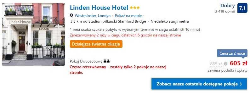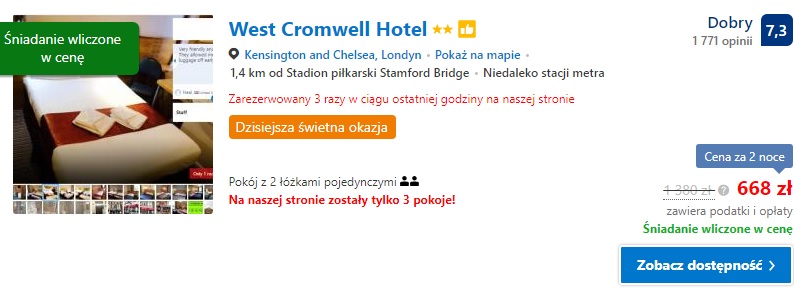 Proponujemy nocleg w West Cromwell Hotel gdzie za dwie noce w pokoju dwuosobowym, ze śniadaniem zapłacimy 668 zł ( 167 zł/os./noc). Drugim obiektem, położonym nieco dalej od stadionu jest Linden House Hotel, gdzie za dwie noce w pokoju dwuosobowym zapłacimy 605 zł (ok. 152 zł/os./noc).