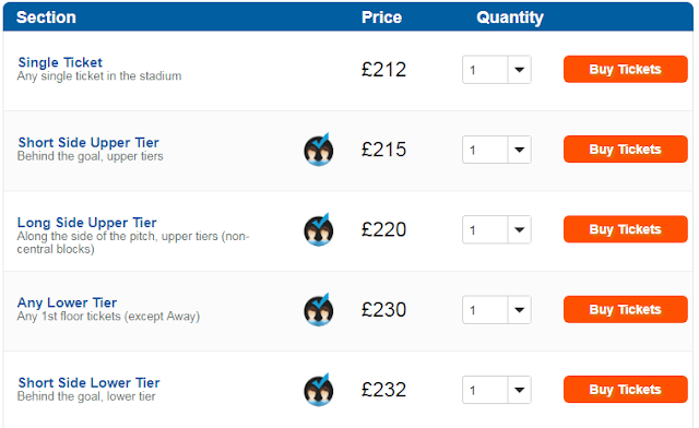 Wejściówki na spotkanie zakupimy za pośrednictwem rynku wtórnego. Najtańszy bilet wraz z opłatami otrzymamy za 265£ (ok. 1295 zł). Należy pamiętać, że większość ofert dotyczy dostawy biletów tylko na terenie Anglii, więc warto uprzedzić znajomych lub hotel o nadejściu przesyłki. REZERWUJ====>