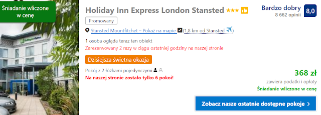Dla odlatujących porannym samolotem z Londyn Stansted, oferujemy Holiday Inn Express London Stansted. Tutaj koszt noclegu dla dwóch osób ze śniadaniem wynosi 368 zł (184 zł os./noc).