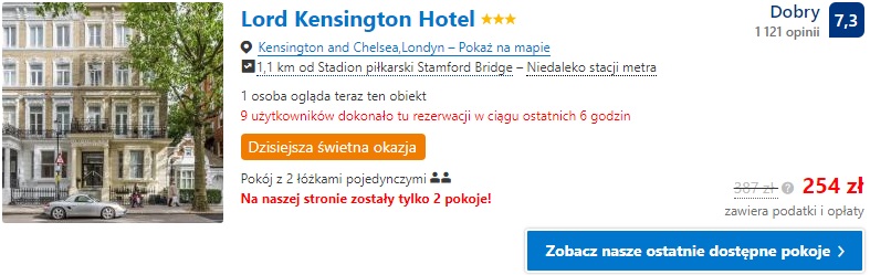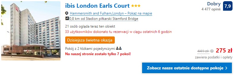 Proponujemy nocleg w Lord Kensington Hotel, gdzie za noc w pokoju dwuosobowym zapłacimy 254 zł (127 zł/os./noc). Drugim obiektem godnym polecenia jest ibis London Earls Court gdzie za noc w pokoju dwuosobowym zapłacimy 275 zł ( ok 138 zł/os./noc).