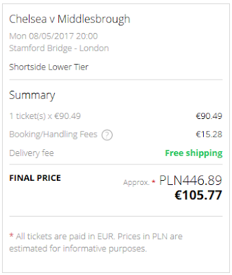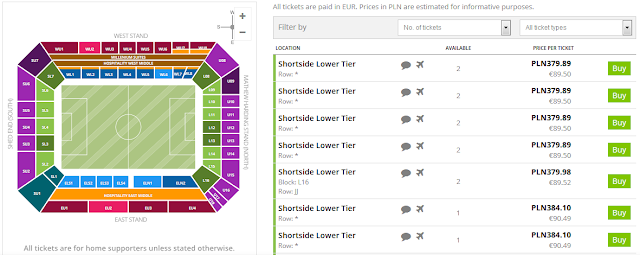 Bilety dostaniemy na stronie pośrednika sprzedaży biletów. Ceny zaczynają się od ok 447 zł (wraz z opłatami serwisowymi). Bilety dostarczane są na terenie Wielkiej Brytanii dlatego warto poinformować obsługę hotelową o spodziewanej przesyłce REZERWUJ ====>