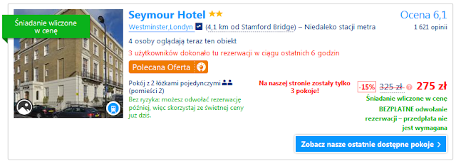 lub pokój dwuosobowy z 2 łóżkami pojedynczymi w Seymour Hotel z śniadaniem w cenie noclegu za 275 zł ( ok 130 zł za osobę za nocleg)