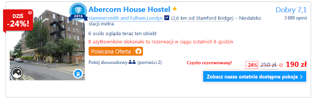 Na jeden nocleg proponujemy obiekty Abercorn House Hostel pokój dwuosobowy za 190 zł (95 zł za osobę za noc).