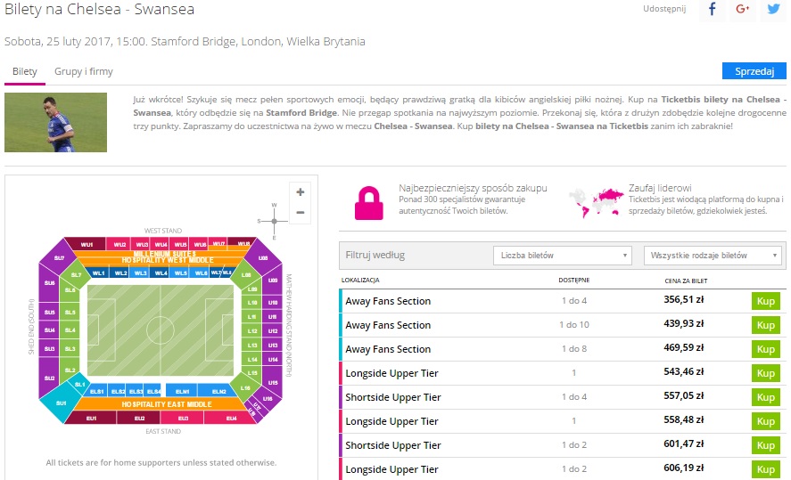 Propozycja lutowa dla sympatyków niebieskiej części Londynu. Przedstawiamy opcję wyjazdu na mecz Chelsea, która podejmie walijskiego jedynaka – drużynę Swansea, której bramki strzeże Łukasz Fabiański. Swansea na razie jest w strefie spadkowej, ale różnice punktowe do wyprzedzających drużyn jest tak niewielka, że w lutym będzie trwał wyścig o obronę Premier League dla Walii. Za przelot/przejazd wraz z biletem na mecz na mecz zapłacimy już od ok. 476zł !