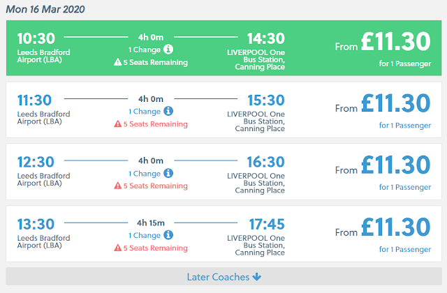 Natomiast transport z lotnisk w Leeds i Manchesterze do Liverpoolu zapewni nam firma przewozowa National Express w cenie kolejno od 12,30 GBP* (ok. 61 zł) REZERWUJ====> oraz 5 GBP* (ok. 25 zł) REZERWUJ====>.