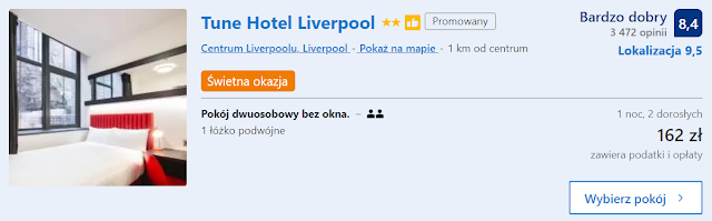 Alternatywą może być Tune Hotel Liverpool. Cena pobytu dla jednej/dwóch osób wynosi 162 zł (81 zł os./noc).