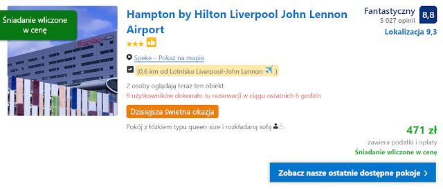 Proponujemy Hampton by Hilton Liverpool John Lennon Airport, w którym koszt noclegu w dniach 19-20 stycznia wynosi 471 zł dla dwóch osób (235, 5 zł os./noc).