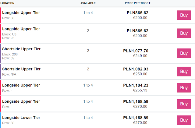 Aktualnie wejściówki można nabyć wyłącznie poprzez rynek wtórny w cenie (wraz z opłatami manipulacyjnymi) od 252 EUR (ok. 1085 zł) REZERWUJ====>.