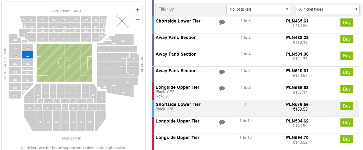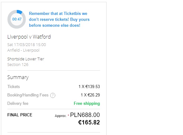 Najtańsze pojedyncze wejściówki na trybunę gospodarzy zakupimy na rynku wtórnym za ok. 688 zł REZERWUJ ==== >. Uwaga! Nie przechodzimy na polską wersję (Stubhub) a pozostajemy w angielskiej wersji strony (ticketbis.net) – znajdziemy tam zdecydowanie tańsze bilety! Warto pamiętać, że bilet może być dostarczony tylko na terenie UK, w związku z czym należy uprzedzić hotel o nadejściu przesyłki, bądź znajomego u którego będziemy nocować podczas pobytu w Anglii.
