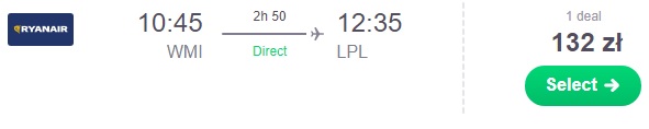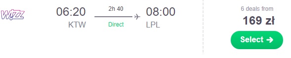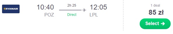 Do Liverpoolu możemy wylecieć dzień przed meczem 16 marca z Gdańska za 74 zł* (cena regularna 119 zł) REZERWUJ ==== > lub z Warszawy za 132 zł REZERWUJ ==== >. Możemy wylecieć również w dniu meczu z Poznania za 85 zł REZERWUJ ==== > lub z Katowic za 124 zł* (cena regularna 169 zł) REZERWUJ ==== >