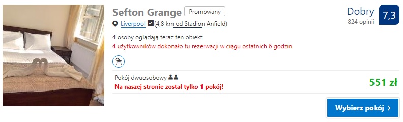 Proponujemy nocleg w obiekcie położonym w sąsiedztwie stadionu, z wysokimi ocenami klientów jakim jest Masters Guest House gdzie za noc w pokoju dwuosobowym zapłacimy 188 zł ( 94 zł/os.). Dwie noce 16.03-18.03 możemy spędzić w Sefton Grange za 763 zł ( ok. 191 zł/os./noc). Jest to najtańsza opcja dwóch noclegów w Liverpoolu w tym okresie, w obiektach położonych niedaleko stadionu. Istnieje możliwość noclegu w dniach 17.03-18.03 również w Sefton Grange za 551 zł ( ok. 276 zł/os.)
