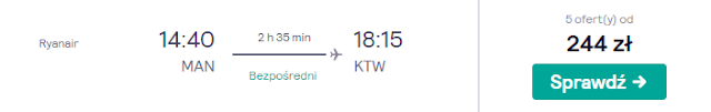 Jeżeli chodzi o powrót proponujemy lot z Birmingham do Krakowa za 109 zł* (cena regularna 156 zł) REZERWUJ====>. Wygodniejszą, ale dużo droższą opcją dla wracających do stolicy Małopolski będzie lot z Manchesteru za 472 zł REZERWUJ====>. Bezpośrednio z Manchesteru wrócimy też do Katowic za 244 zł REZERWUJ====>.