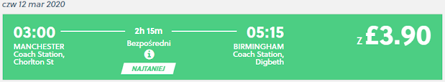 Chcąc zdążyć na poranny lot powrotny z Birmingham do Krakowa będziemy musieli zarezerwować podróż w środku nocy z Manchesteru do Birmingham REZERWUJ====>, a następnie na tamtejsze lotnisko REZERWUJ====>, a w sumie za dwa przejazdy zapłacimy 8 GBP (ok. 42 zł). Na lotnisko w Manchesterze dotrzemy już bez takich kombinacji, płacąc za transport od 4.40 GBP (ok. 23 zł) REZERWUJ====>.