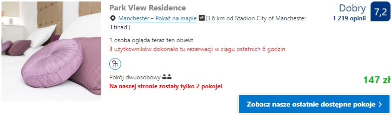 Proponujemy nocleg w dwóch obiektach położonych niedaleko stadionu. Pierwszym jest Park View Residence gdzie za noc w pokoju dwuosobowym zapłacimy 147 zł ( ok. 74 zł os./noc). Drugim obiektem jest Hatters at Hilton Chambers gdzie za noc w pokoju dwuosobowym zapłacimy 213 zł ( ok. 107 zł os./noc).