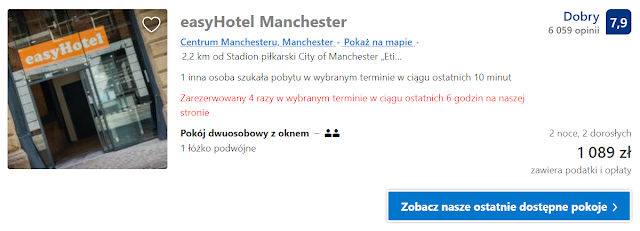 Godnym uwagi hotelem jest oddalony nieco ponad dwa kilometry od stadionu Etihad easyHotel Manchester, który oferuje dwudniowy pobyt w pokoju dwuosobowym za 1089 zł (ok. 272,5 zł os./noc).