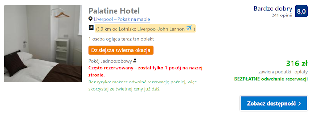 Dla sympatyków, którzy reflektują krótszy pobyt w Anglii zalecamy Palatine Hotel. Kwatera znajduje się niecałe cztery kilometry od portu lotniczego w Liverpoolu. Za nocleg w dniach 14-15 grudnia w pokoju jednoosobowym zapłacimy 316 zł oraz 414 za dwuosobowy (212 zł os./noc).