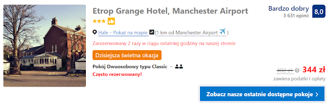 Innym wyborem może być nocleg w Clayton Hotel, Manchester Airport, w którym za jednodniowy pobyt zapłacimy 540 zł za pokój jednoosobowy ze śniadaniem oraz 423 zł za pokój dwuosobowy (211,5 zł os./noc).