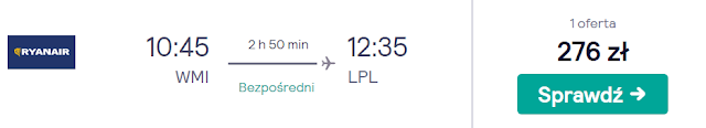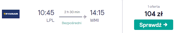 Natomiast z Liverpoolu dotrzemy do Poznania za 94 zł REZERWUJ====>, Warszawy Modlin za 104 zł REZERWUJ====> lub Szczecina za 108 zł REZERWUJ====>.