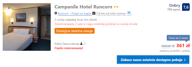 Dla kibiców opuszczających Wielką Brytanię z Liverpoolu oferujemy Campanile Hotel Runcorn, gdzie za nocleg w tym samym terminie zapłacimy 372 zł za jedną oraz 361 zł za dwie osoby (ok. 90,5 zł os./noc).