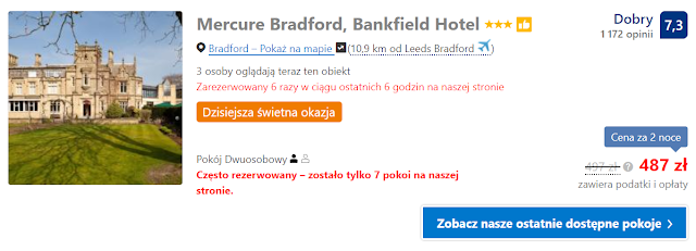 Ofertą z Leeds będzie Mercure Bradford, Bankfield Hotel, w którym pobyt w dniach 19-21 kwietnia kosztuje 598 zł za pokój jednoosobowy oraz 487 zł za pokój dwuosobowy (ok. 122 zł os./noc).