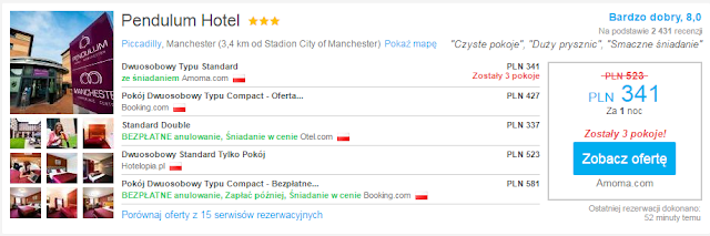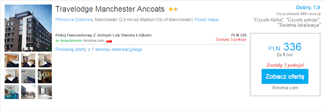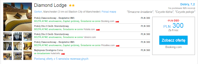 Przygotowaliśmy trzy propozycję noclegu w hotelach 2/3 gwiazdkowych ze śniadaniem w cenie w niedalekiej odległości od Etihad Stadium. Cena za pokój dwuosobowy zaczyna się od 300 zł (150 zł od osoby za nocleg) zarezerwuj TUTAJ====>