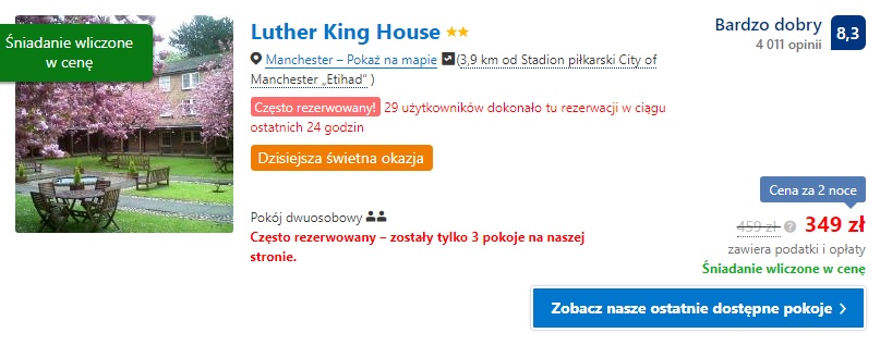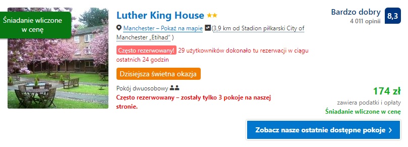 Proponujemy nocleg w Luther King House gdzie za noc w pokoju dwuosobowym ze śniadaniem zapłacimy 174 zł ( 87 zł/os.). W przypadku dwóch noclegów w tym samym obiekcie zapłacimy 349 zł ( ok. 88 zł/os./noc)