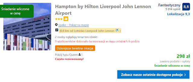 Kibice opuszczający Wielką Brytanię z portu lotniczego w Liverpoolu oferujemy Hampton by Hilton Liverpool John Lennon Airport. W tym obiekcie za pokój dwuosobowy zapłacimy 298 zł (149 zł os./noc). W cenę wliczono śniadanie.