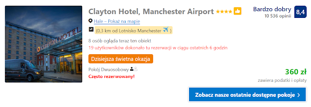 Dla fanów reflektujących wylot z Manchesteru proponujemy oddalony o 400 metrów od lotniska Clayton Hotel, Manchester Airport w cenie 379 zł wraz ze śniadaniem dla jednej osoby oraz 360 zł (180 zł os./noc) dla dwóch osób.
