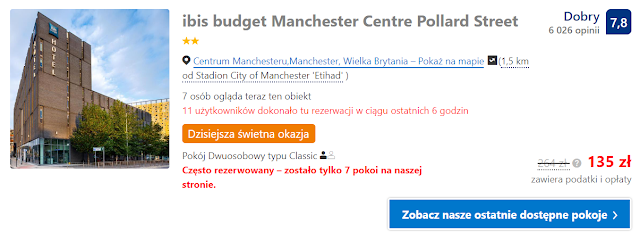 Dla tych co wolą przebywać bliżej stadionu Etihad polecamy ibis budget Manchester Centre Pollard Street, gdzie koszt noclegu w pokoju jednoosobowym wraz ze śniadaniem wynosi 162 zł oraz 135 zł (67,5 zł os./noc) za kwaterę dwuosobową.