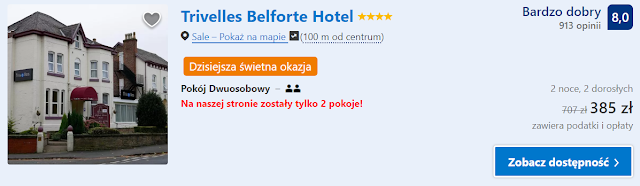 Dla kibiców, którzy przylecą do Wielkiej Brytanii dzień wcześniej oferujemy dwudniowy pobyt w Trivelles Belforte Hotel. Za nocleg w pokoju jednoosobowym zapłacimy 337 zł, zaś za dwuosobowy 385 zł (ok. 96,5 zł os./noc).