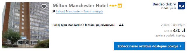 Proponujemy nocleg w zlokalizowanym niecałe 5 kilometrów od stadionu Old Trafford Milton Manchester Hotel, gdzie koszt pobytu wynosi 225 zł za jedną oraz 160 zł za dwie osoby (80 zł os./noc).