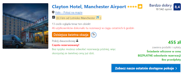 Polecamy poniższe obiekty zlokalizowane w newralgicznych dla wyjazdu miejscach. Pierwszym miejscem jest oddalony o 400 metrów od lotniska w Manchesterze Clayton Hotel, Manchester Airport. Za nocleg w pokoju jednoosobowym wraz ze śniadaniem zapłacimy 455 zł i 456 zł (228 zł os./noc) za dwuosobowy.