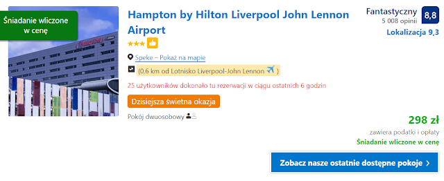 Fani opuszczający Anglię z Liverpoolu oferujemy Hampton by Hilton Liverpool John Lennon Airport. Hotel znajduje się 200 metrów od portu lotniczego, a koszt noclegu dla dwóch osób wynosi 298 zł (149 zł os./noc).