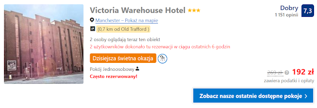 Dla największych kibiców Czerwonych Diabłów proponujemy Victoria Warehouse Hotel, który zlokalizowany jest 300 metrów od stadionu Old Trafford. Koszt pobytu dla jednej i dwóch osób wynosi kolejno 192 zł i 276 zł (138 zł os./noc).